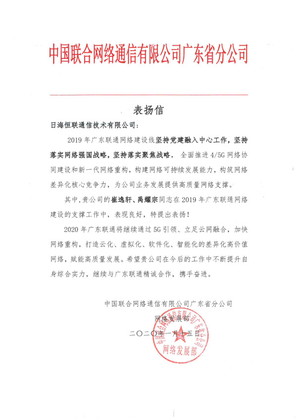 轉(zhuǎn)發(fā)“中國聯(lián)合網(wǎng)絡(luò)通信有限公司廣東省分公司網(wǎng)絡(luò)發(fā)展部”對我公司員工的一封表揚信